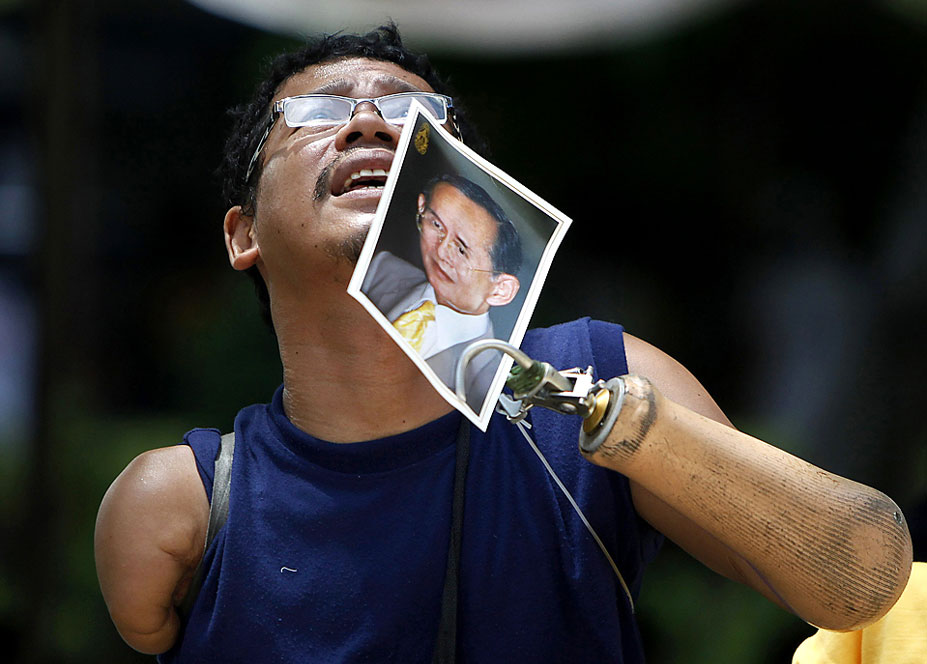 22日,在泰国首都曼谷,一名男子在医院外为普密蓬·阿杜德的健康祈祷。 81岁高龄的泰国国王普密蓬·阿杜德于19日因发烧住进医院接受治疗。图片来源:中国新闻网