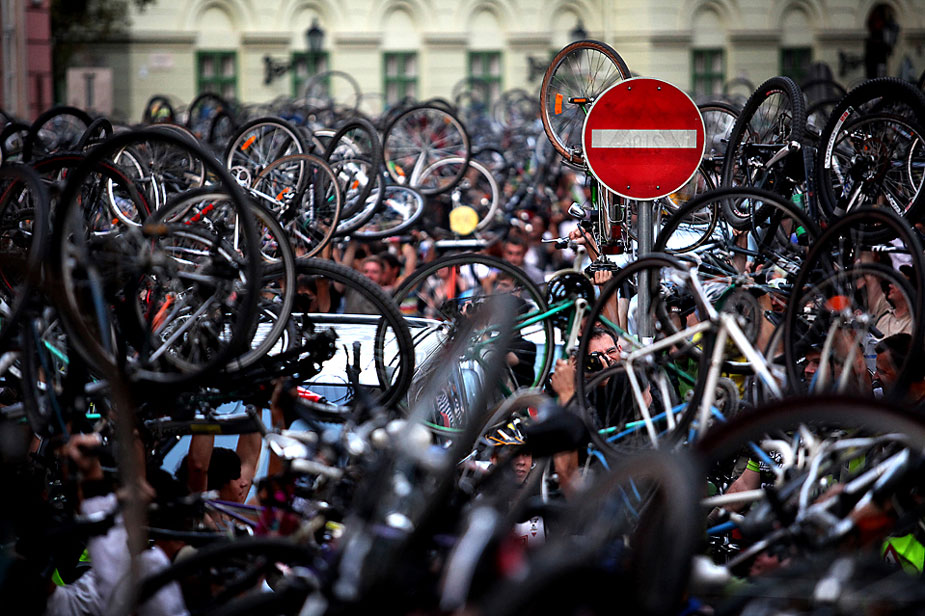 22日是世界无车日,在布达佩斯的市政厅外,人们高举自行车,参加在这里举行的“单车临界点”集会。这场活动旨在推广更环保的交通方式。图片来源:中国新闻网