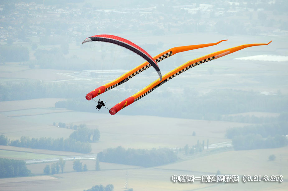 9月20日,法国东南部举行第36届伊卡洛斯杯自由飞行大赛,来自世界各地近万名参赛者怀揣着梦想,驾驶着自制飞行器飞上天空。图片来源:中国新闻网