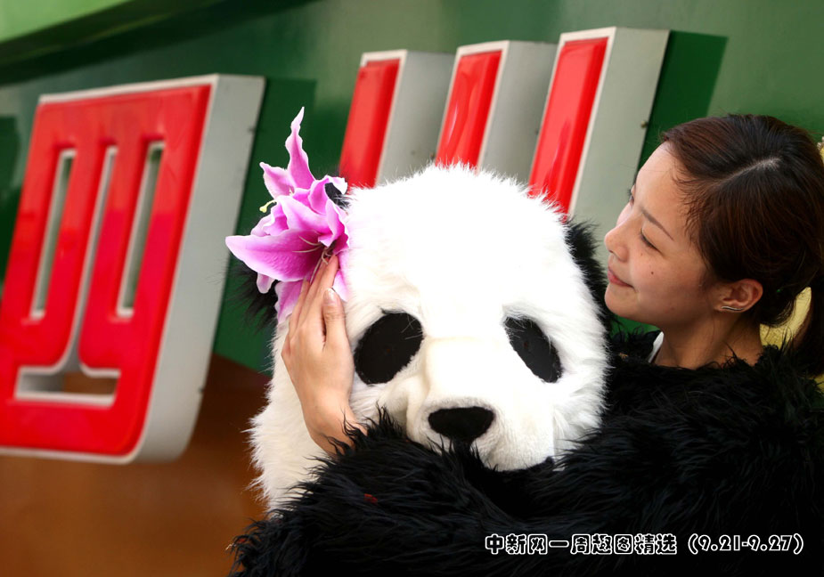 9月24日,来自四川“奋进四川彩车”的美女演员排练之余精心打扮道具。图片来源:中国新闻网