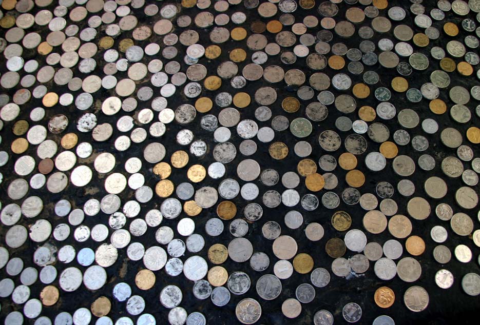 扎什伦布寺里的一处圣迹,即高僧大德触摸或者莅临过的地方。墙上抹过酥油,有了粘性,信徒朝拜路过时会粘贴银币于其上,有如在庙堂敬献钱币。