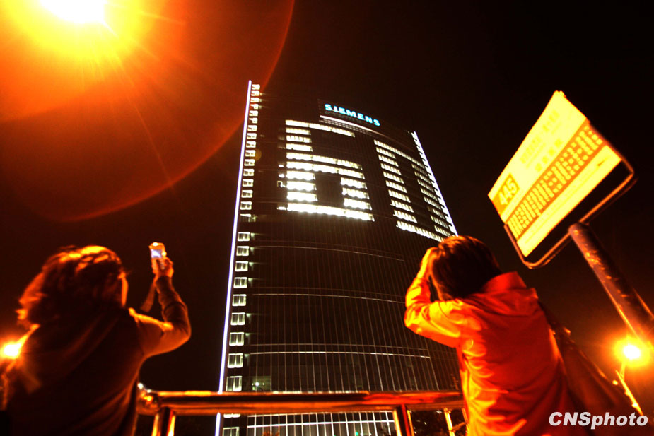9月28日晚,北京一外企办公大楼点亮“60”字样,庆祝新中国成立60周年。中新社发 张宇 摄