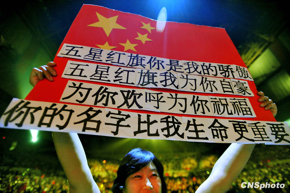 当地时间9月20日,以“感动世界,中国有我”为主题的全球华人共庆新中国成立六十周年《同一首歌》——走进美国旧金山大型演唱会圆满落幕。 一位宫姓女士自制了一面五星红旗,用独特的方式祝福新中国六十华诞。 中新社发 陈钢 摄