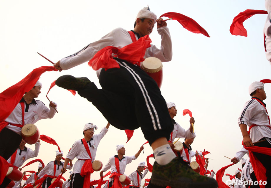9月16日,千余名来自陕西安塞的腰鼓队员在北京密云训练基地和其他方阵合练。该方阵队员全部是来自陕西省延安市安塞县的农民,10月1日他们将走在群众游行队伍中,在天安门城楼前舞起安塞腰鼓。该方阵也是群众游行队伍中唯一一支京外队伍,唯一一个全部由农民组成的方阵。 中新社发 杜洋 摄