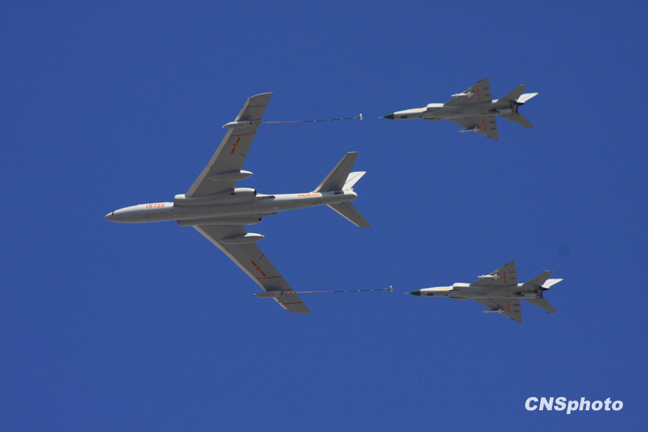 2009年10月1日,中华人民共和国成立60周年庆祝大会在北京天安门广场举行。图为加受油机梯队通过天安门广场上空。中新社发 郭国权 摄
