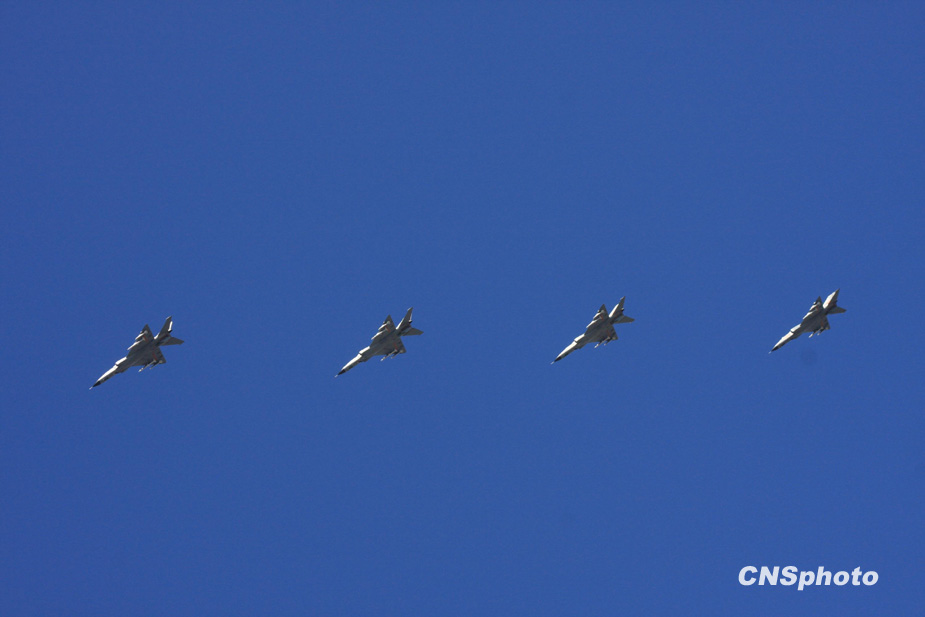 2009年10月1日,中华人民共和国成立60周年庆祝大会在北京天安门广场举行。图为歼击机梯队飞过天安门广场上空。中新社发 郭国权 摄