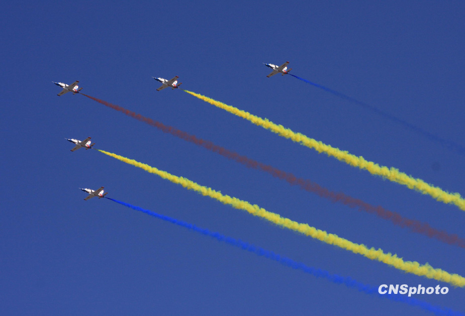 2009年10月1日,中华人民共和国成立60周年庆祝大会在北京天安门广场举行。图为教练机梯队飞过天安门广场上空。中新社发 郭国权 摄