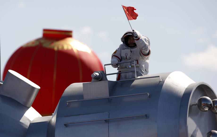 10月1日,中华人民共和国成立60周年庆祝大会在北京举行,航天员翟志刚等航天人在群众游行队伍中亮相。 中新社发 盛佳鹏 摄