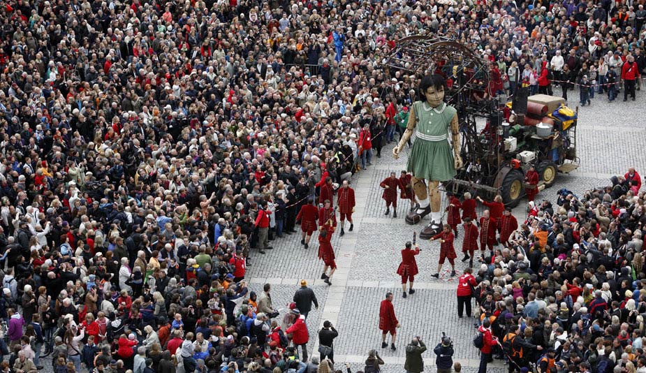 10月2日,来自法国一家戏剧公司的两个巨型提线木偶亮相柏林街头,它们将在露天剧场进行表演,以此纪念柏林墙推倒20周年。图片来源:中国新闻网