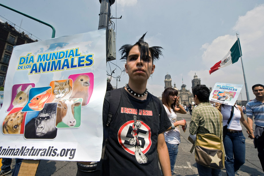 10月4日,在墨西哥首都墨西哥城,参加世界动物日活动的人们头带面具,手举图片,呼吁人们关注动物权益。来源:中国新闻网