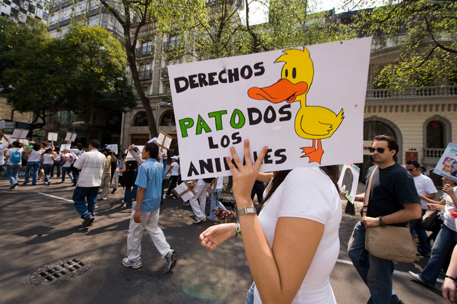 10月4日,在墨西哥首都墨西哥城,参加世界动物日活动的人们头带面具,手举图片,呼吁人们关注动物权益。来源:中国新闻网