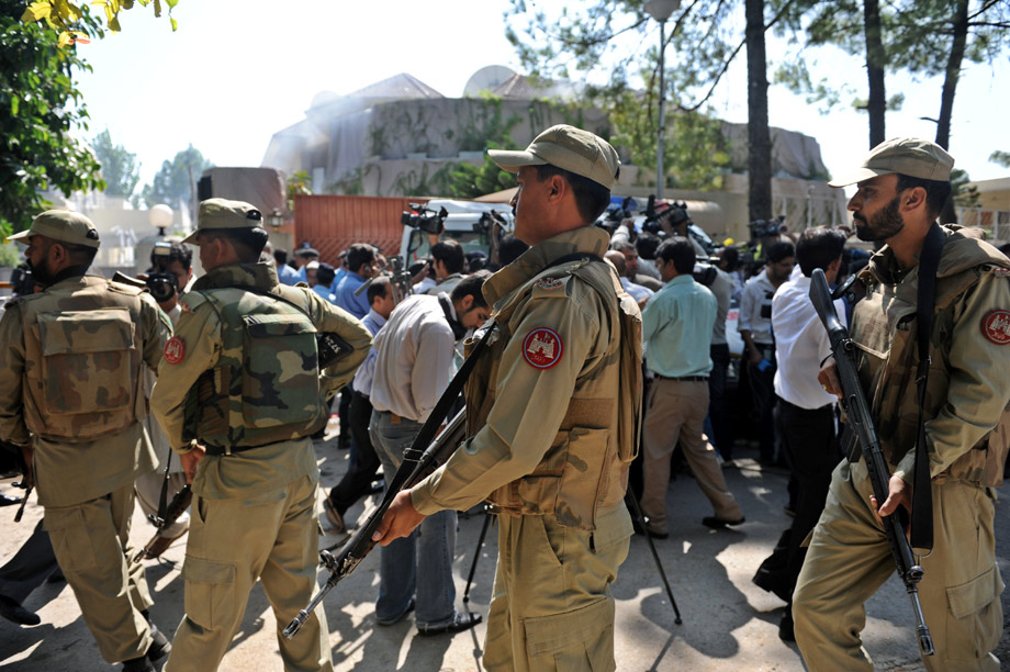 中新网10月5日电 据法新社报道,联合国位于巴基斯坦伊斯兰堡的办公楼内5日发生自杀式袭击爆炸,导致3人死亡。报道称,当时有80人在该办公楼工作,遇害者中包括一名外国人,另外2人是巴基斯坦妇女。还有6名伤者被送往医院。图为安全人员在发生爆炸的办公室附近警戒。