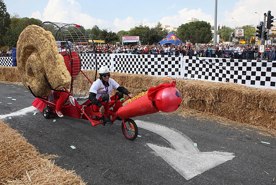 50辆“肥皂盒车”10月7日参加了耶路撒冷举行的“肥皂盒车”趣味竞赛。赛道设置在市中心一条大街的一段斜坡上,比赛者驾驶各种千奇百怪的赛车从起点一路滑下。图片来源:中国新闻网
