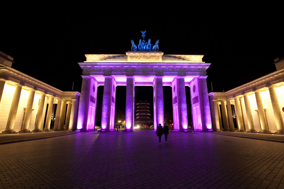 13日晚在德国首都柏林,勃兰登堡门在“灯节”的提前预演中被五彩灯饰照亮。图片来源:中国新闻网