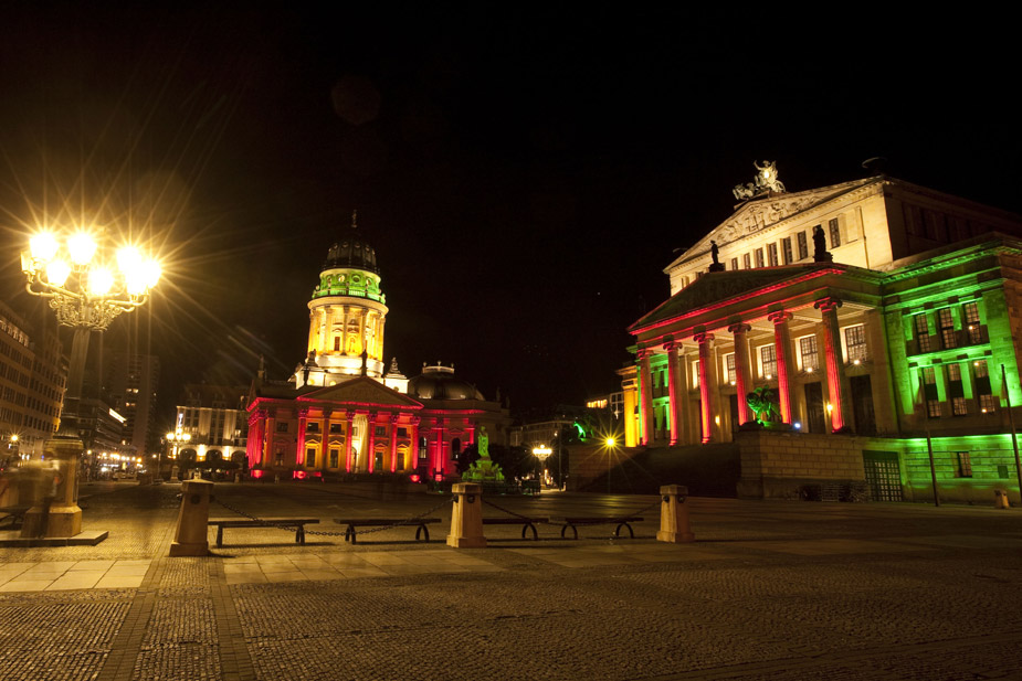 10月14日德国柏林将迎来一年一度的“灯节”。13日晚在德国首都柏林,柏林音乐厅在“灯节”预演中被五彩灯饰照亮。