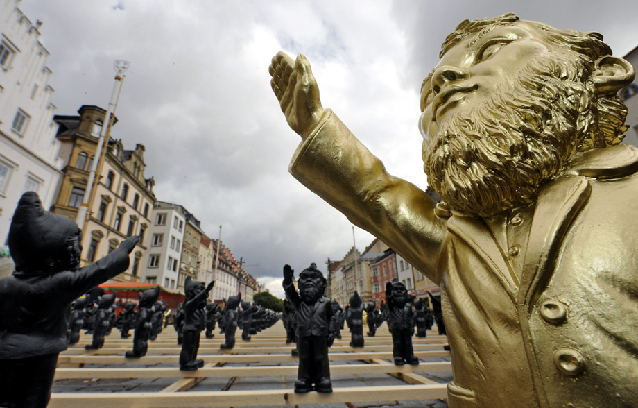 10月14日,德国施特劳宾市街头摆放了1250个行纳粹礼的花园土地神像,“行纳粹礼的花园土地神”其实是一款雕塑作品,是由59岁的德国艺术家奥特马尔·赫勒尔创作的目的在于提醒人们警惕法西斯思想,反对使用法西斯思想控制大众。