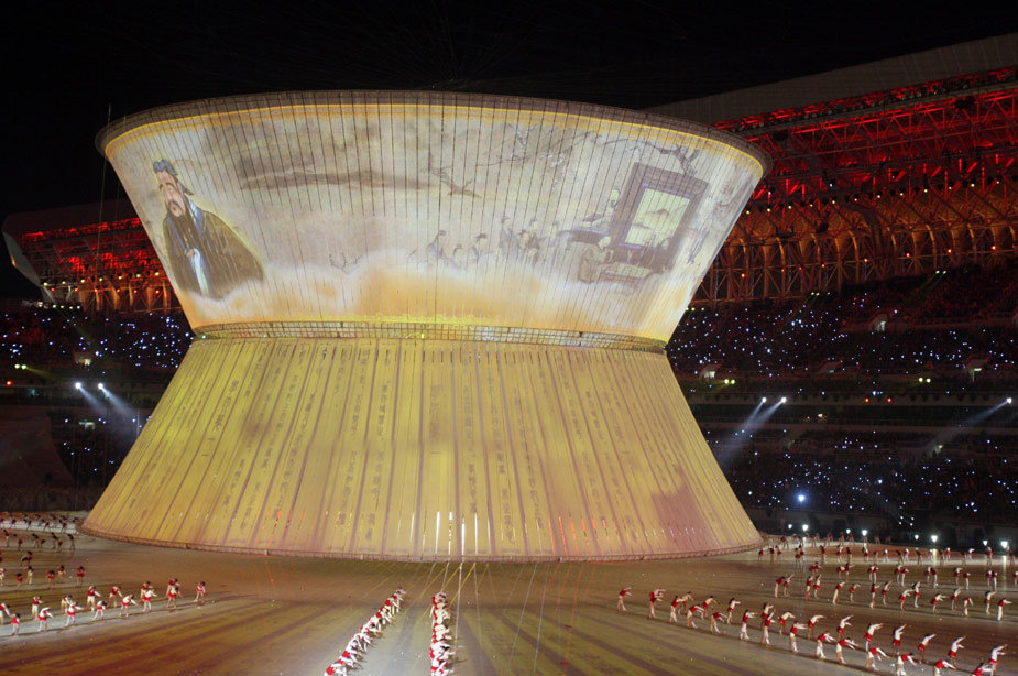 十月十六日晚,中华人民共和国第十一届运动会在山东济南奥体中心隆重开幕。图为“孔子”现身全运会开幕式。中新社发 汤彦俊 摄