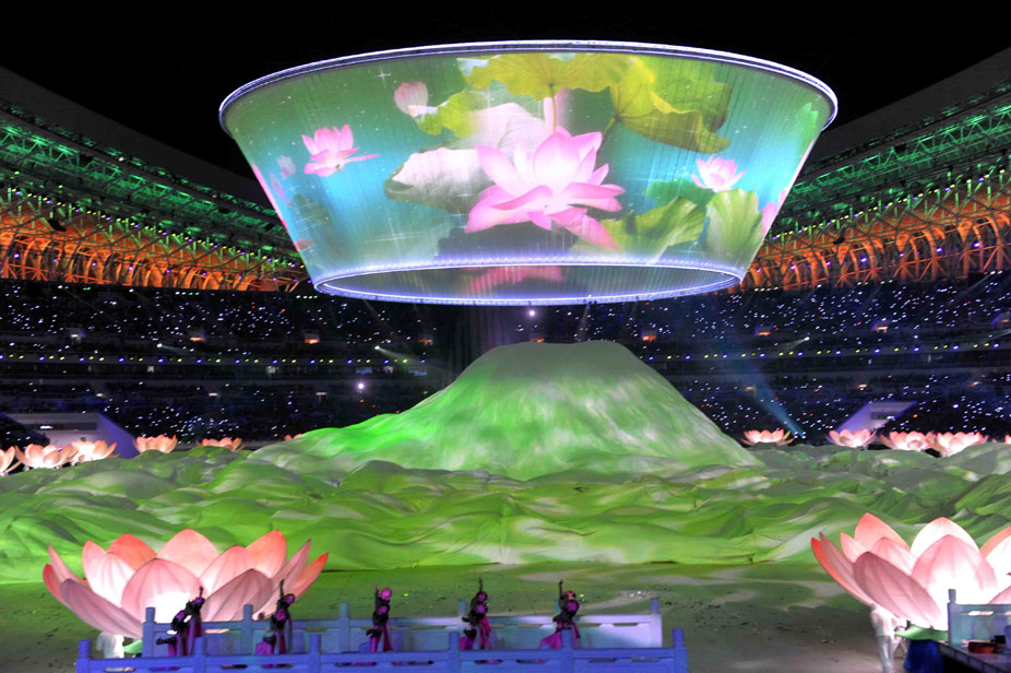 十月十六日晚,中华人民共和国第十一届运动会在山东济南奥体中心隆重开幕。图为文艺晚会上的“巨碗”视频演绎和平、和谐。中新社发 陈文 摄