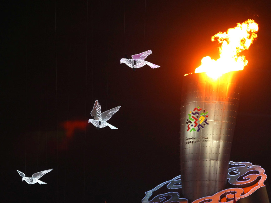 十月十六日晚,中华人民共和国第十一届运动会在山东济南奥体中心隆重开幕。图为第十一届全国运动会圣火在山东济南点燃。中新社发 富田 摄