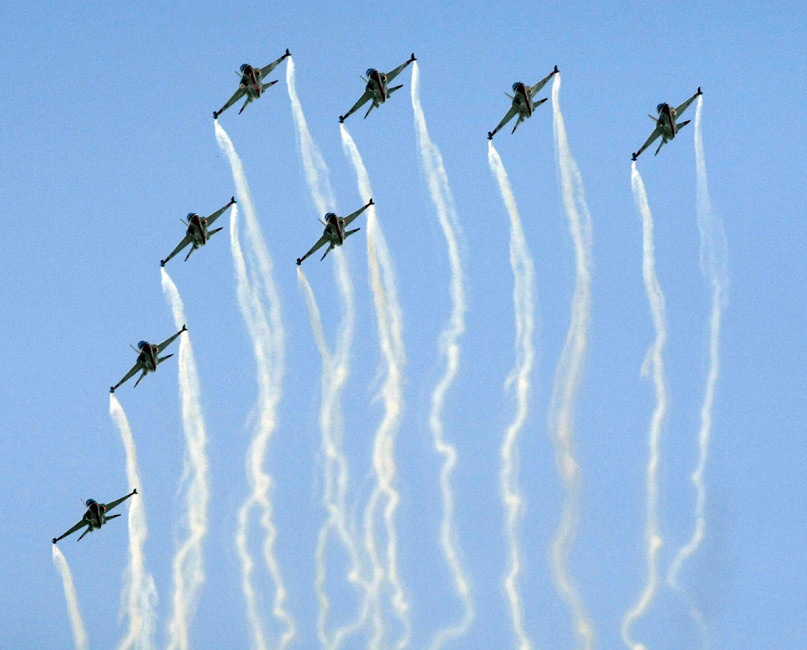 10月20日,韩国黑鹰特技飞行表演队在2009首尔国际航空航天与国防展上进行精彩的特技飞行表演。 图片来源:中国新闻网