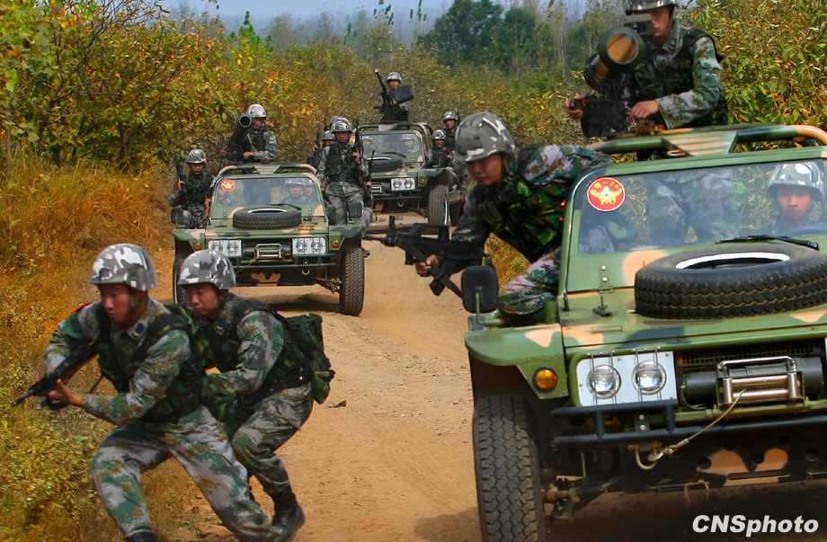 解放军济南军区“前锋-2009A”军事演习,将于10月21日在某合同战术训练基地举行,图为即将参加演习的空降兵部队10月20日在进行针对性训练。这次演习主要是由兵力兵器数量规模向信息火力效能聚优转变、指挥的重心由主攻方向上的重点突破向作战关节要害的体系毁瘫转变、火力的运用由概略粗放决策向科学精细筹划转变、协同的重点由地面步坦行动向陆空火力协调转变、行动的控制由时间位置推进量向效果态势达成度转变、作战的目的由歼敌夺地向控要制权转变。 中新社发 宋吉河 摄