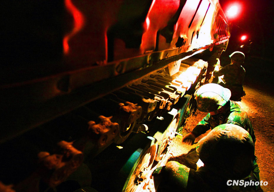 当晚国防大学防务学院、空军指挥学院的外军学员,以及英国、以色列、土耳其、巴基斯坦等国军事观察员亲临现场观摩了后勤保障战斗准备、自行榴弹炮占领阵地、装甲车辆“摸黑”开进等战斗要素。图为后勤保障基地抢修装甲战车。中新社发 宋吉河 摄