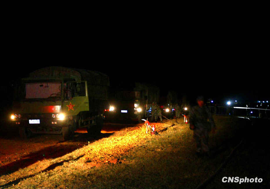 当晚国防大学防务学院、空军指挥学院的外军学员,以及英国、以色列、土耳其、巴基斯坦等国军事观察员亲临现场观摩了后勤保障战斗准备、自行榴弹炮占领阵地、装甲车辆“摸黑”开进等战斗要素。图为运输车辆夜间加油保障。中新社发 宋吉河 摄