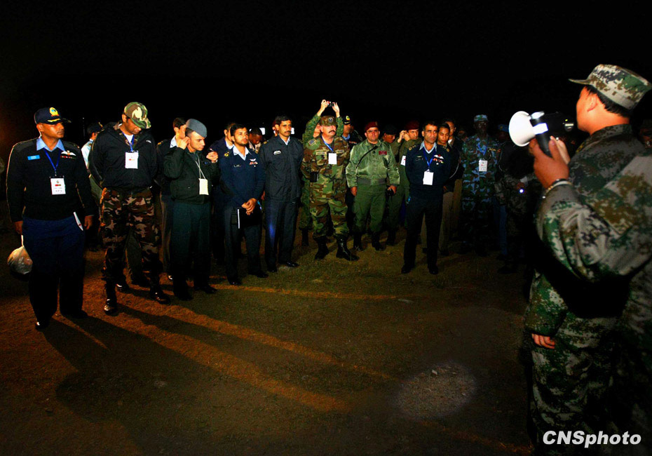当晚国防大学防务学院、空军指挥学院的外军学员,以及英国、以色列、土耳其、巴基斯坦等国军事观察员亲临现场观摩了后勤保障战斗准备、自行榴弹炮占领阵地、装甲车辆“摸黑”开进等战斗要素。图为参观后勤保障基地。中新社发 宋吉河 摄