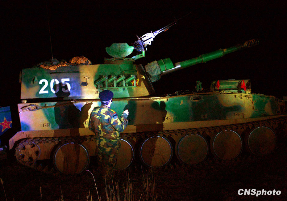 当晚国防大学防务学院、空军指挥学院的外军学员,以及英国、以色列、土耳其、巴基斯坦等国军事观察员亲临现场观摩了后勤保障战斗准备、自行榴弹炮占领阵地、装甲车辆“摸黑”开进等战斗要素。中新社发 宋吉河 摄