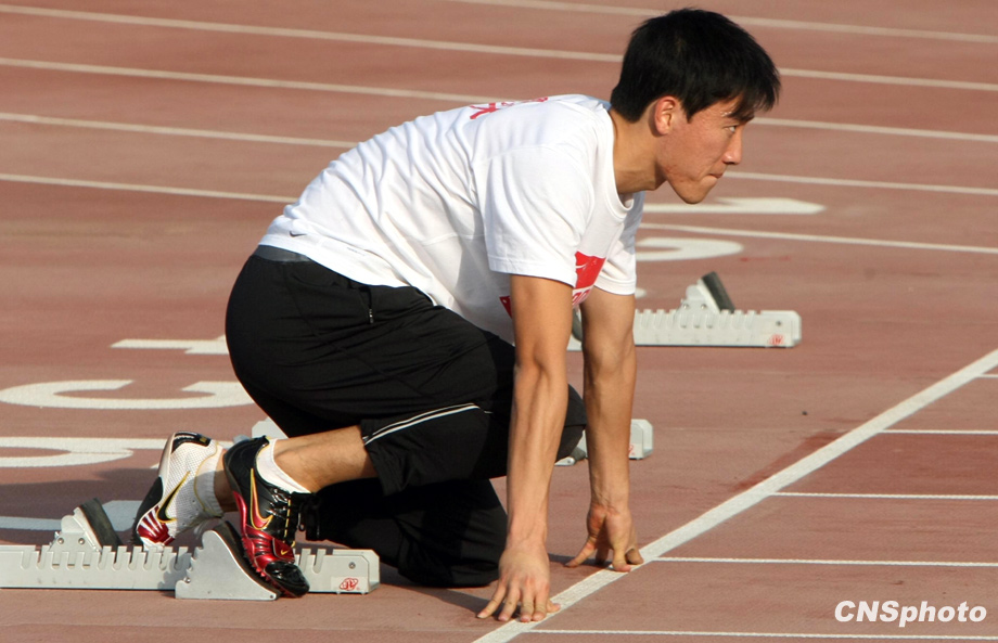 10月22日下午,“飞人”刘翔亮相济南奥体中心田径训练场,在教练孙海平的带领下,轻松备战全运会。来源:中国新闻网