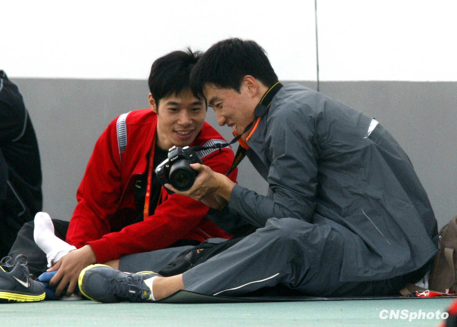 10月22日下午,“飞人”刘翔亮相济南奥体中心田径训练场,在教练孙海平的带领下,轻松备战全运会。来源:中国新闻网