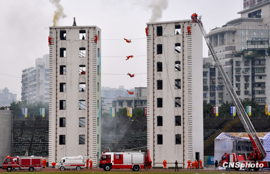 10月23日下午3时40分,推进“平安重庆”建设突发事件应急演练在该市渝中区大田湾体育场举行,重庆各警种突精锐力量重装登场,将各类事件一一化解。图为高层建筑灭火救援中,消防官兵钩梯联挂展开高楼营救工作。中新社发 曹多然 摄