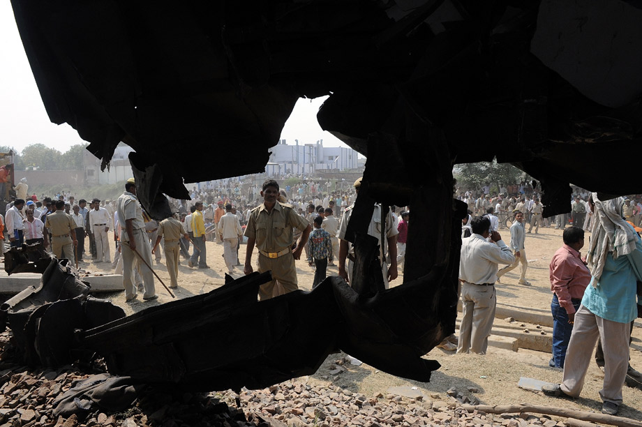 周三(21日)在距离印度首都新德里约80公里的马图拉,救援人员在火车相撞现场工作。当日早晨,印度一列来自西南部果阿的快运列车与一列来自西部梅瓦尔的快运列车在此相撞,致使21人丧生、17人受伤。来源:来源:中国新闻网