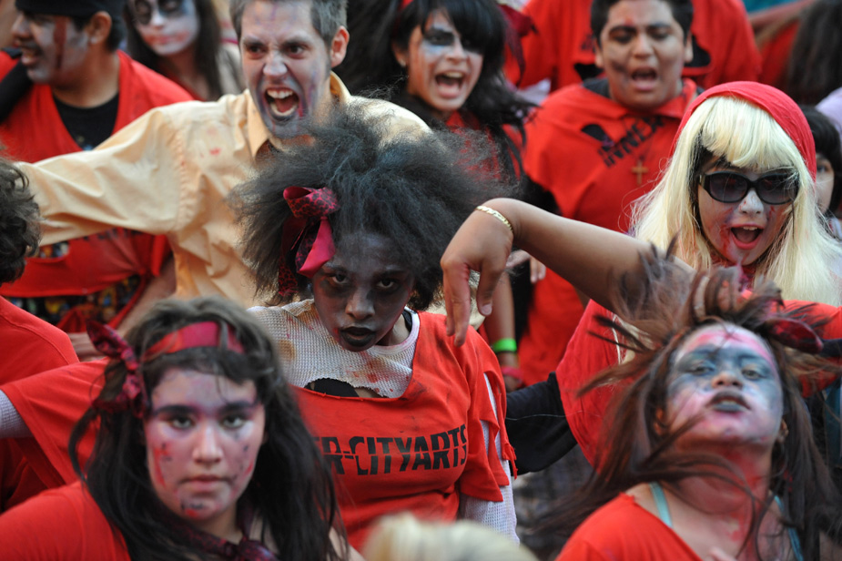 25日,“战栗全世界”活动在全球300多座城市同期举行,全球一共有大约20000人同时跳起了迈克·杰克逊著名的战栗舞。图片来源:中国新闻网