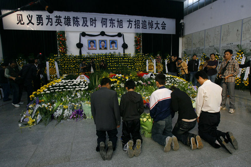 10月28日上午,湖北荆州市在市殡仪馆举行隆重追悼大会,悼念陈及时、何东旭、方招三位舍己救人大学生。数万群众赶到追悼会现场,手捧菊花为英雄道别。