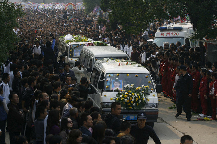 10月28日上午,湖北荆州市在市殡仪馆举行隆重追悼大会,悼念陈及时、何东旭、方招三位舍己救人大学生。数万群众赶到追悼会现场,手捧菊花为英雄道别。
