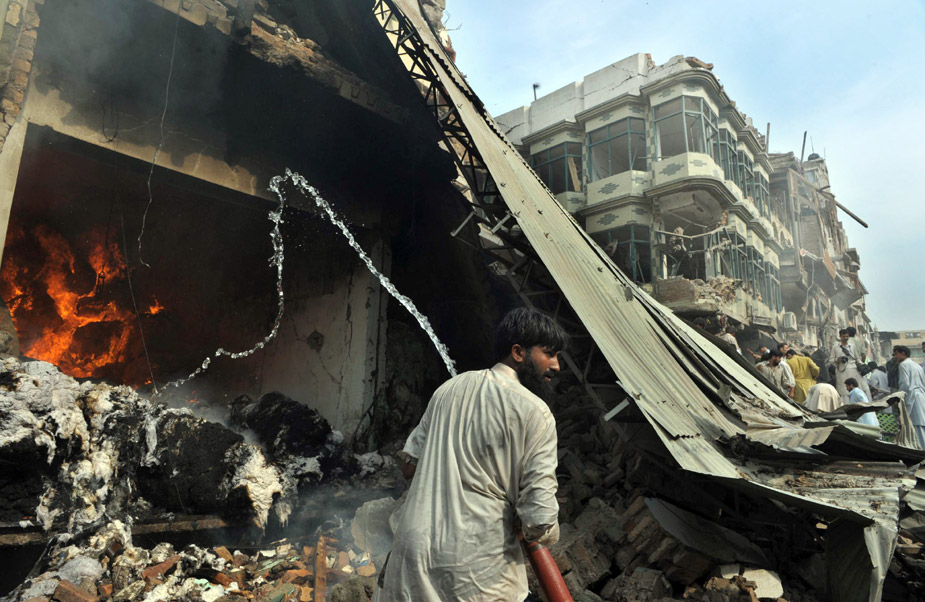 10月28日,巴基斯坦西北部城市白沙瓦一个人口密集的集市遭汽车炸弹袭击。图片来源:中国新闻网