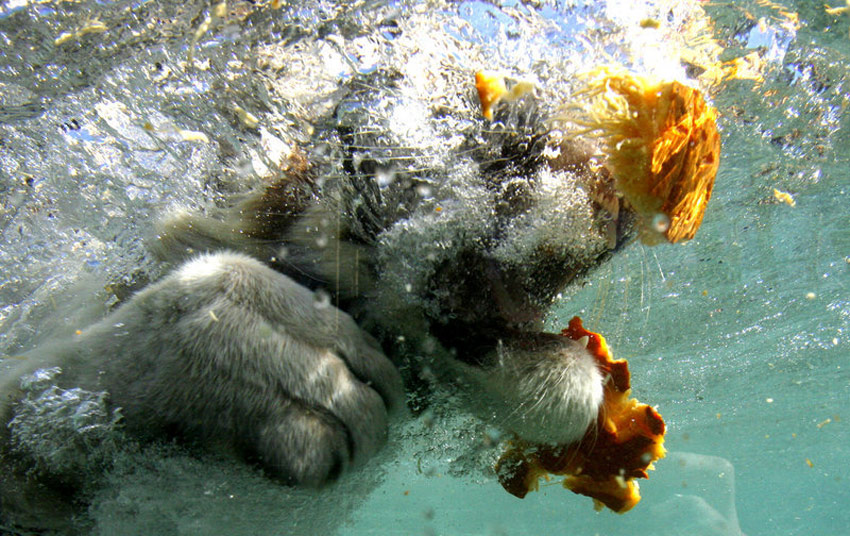 10月28日,美国加利福尼亚州Vallejo,六旗探索王国游乐园里的孟加拉虎在水下撕咬万圣节南瓜。