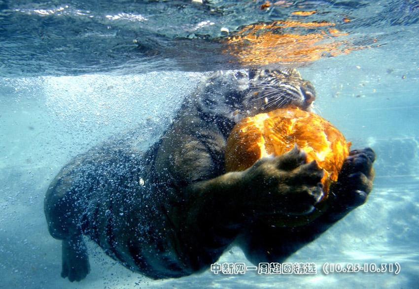 10月28日,美国加利福尼亚州Vallejo,六旗探索王国游乐园里的孟加拉虎在水下撕咬万圣节南瓜。>>点击观看详细内容
