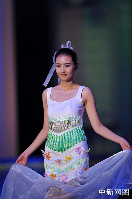10月31日晚,“2009中华小姐环球大赛”总决赛上,12名入围总决赛的佳丽身着各式服装展现曼妙身姿,此外大赛还设计了一套“废品服装”呼吁环境保护。中新网记者 金硕 摄