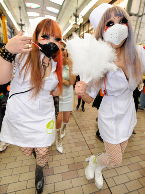 10月31日是西方的“万圣节”,世界各地的群众穿着奇异的服饰、打扮鬼魅的造型迎接“鬼节”的到来。图为在日本长崎,女孩们穿着奇异的服饰迎接鬼节。