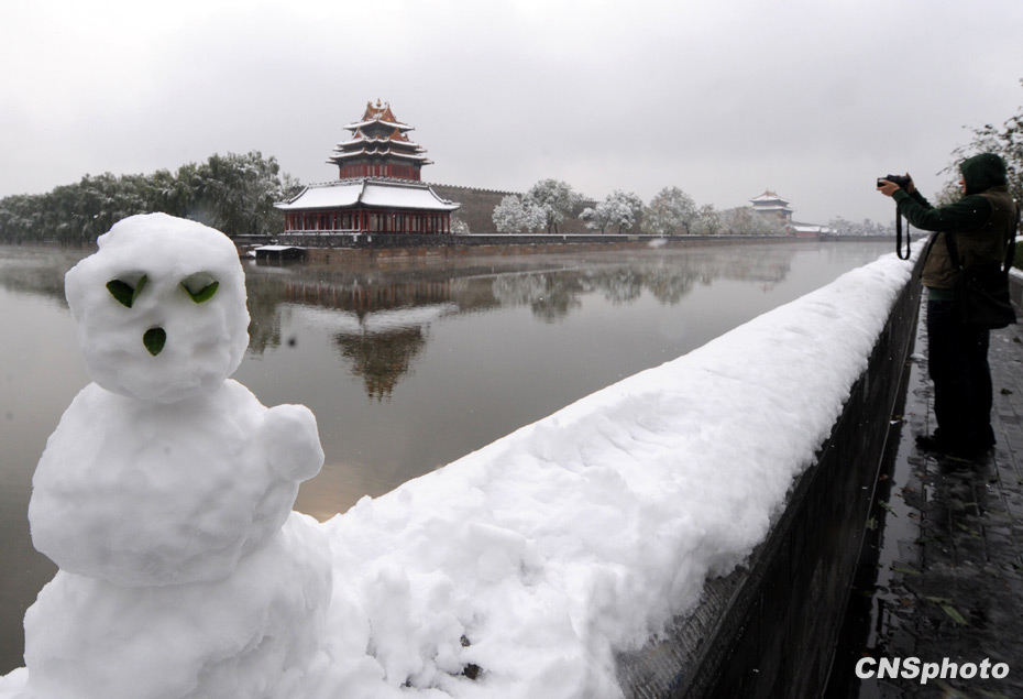 11月1日,深秋的北京大雪纷飞银装素裹,人们在故宫护城河边做起雪人。中新社发 廖攀 摄