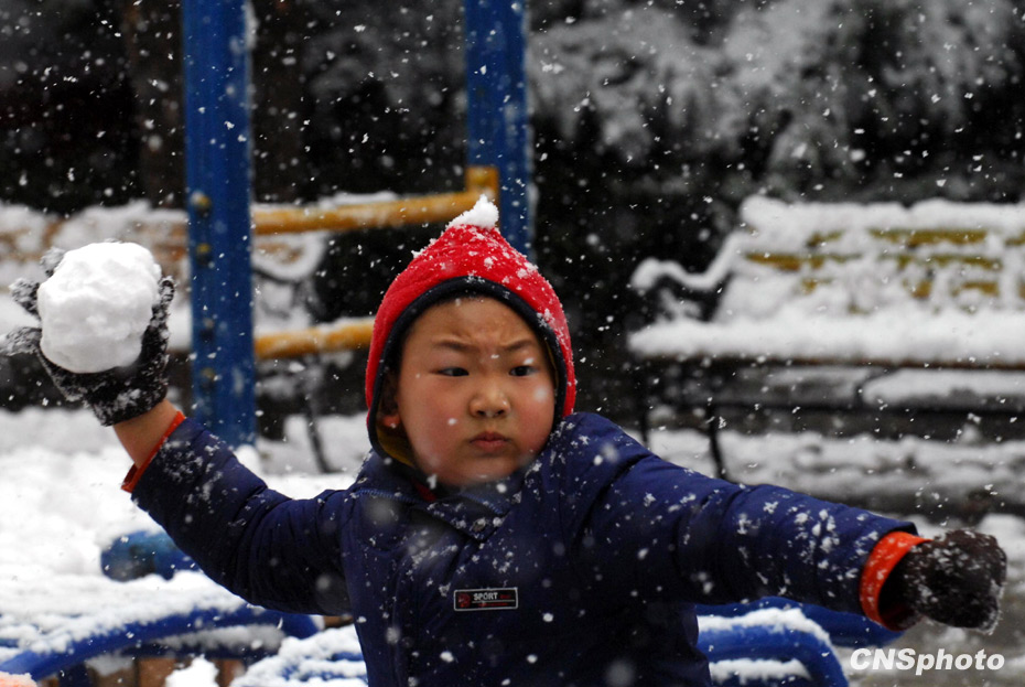 11月1日上午,北京下起一场大雪,为孩子们打雪仗提供了充分的“弹药”。中新社发 侯宇 摄