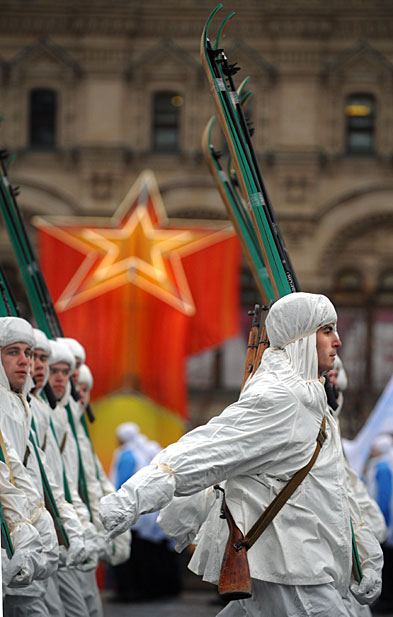 11月7日,俄罗斯士兵身穿二战时期的军服在莫斯科红场举行阅兵阅兵式纪念1941年红场阅兵。图片来源:中国新闻网