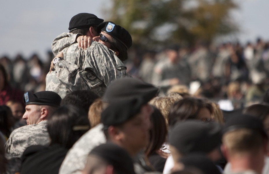 2009年11月10日,在美国得克萨斯州胡德堡陆军基地,士兵在悼念仪式上哭泣。当日,美国德克萨斯州胡德堡陆军基地举行仪式悼念枪击案遇难者。 图片来源:中国新闻网
