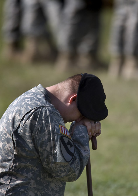 2009年11月10日,在美国得克萨斯州胡德堡陆军基地,士兵在悼念仪式上哭泣。当日,美国德克萨斯州胡德堡陆军基地举行仪式悼念枪击案遇难者。 图片来源:中国新闻网