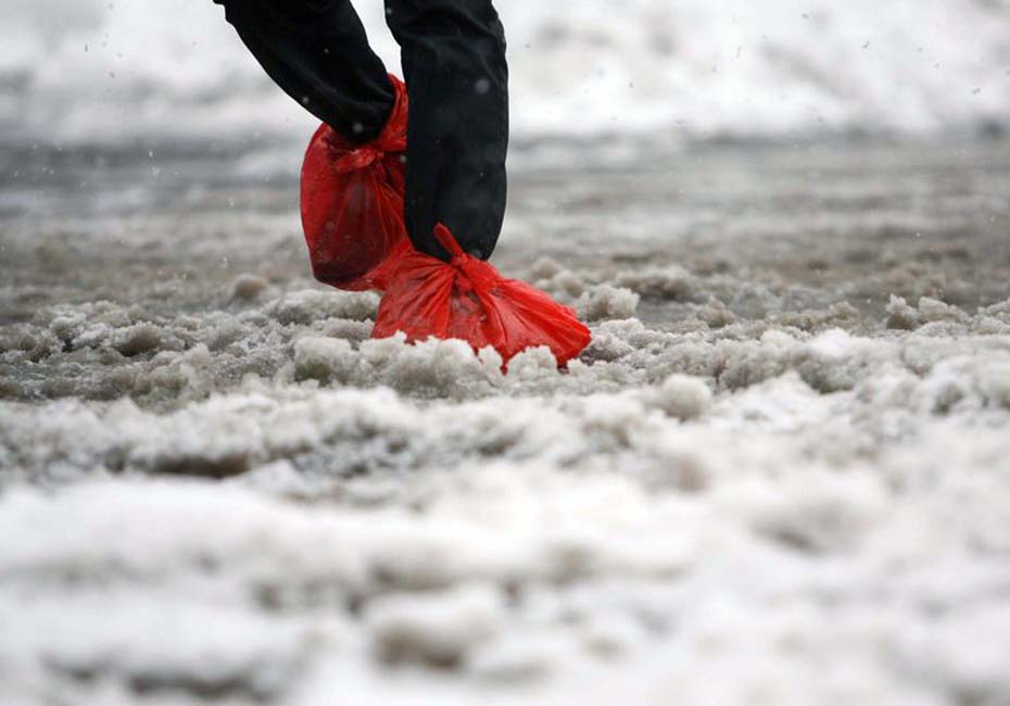图为行人在脚上套上塑料袋。崔华瑞 摄