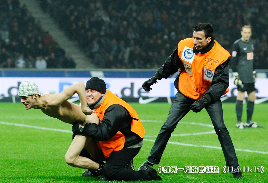 11月8日,09/10德甲第12轮赛事柏林赫塔主场0-1负于科隆,连续11轮联赛不胜。一名愤怒的柏林赫塔球迷冲进球场内疯狂的裸奔。图片来源:中国新闻网>>点击观看详细内容