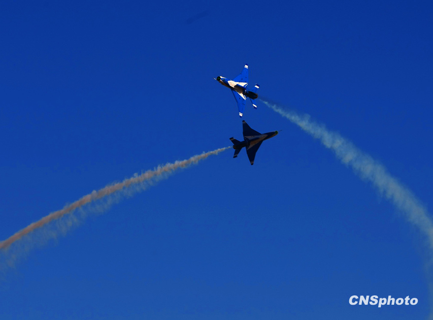 庆祝中国人民解放军空军成立60周年飞行表演,11月15日上午在北京沙河机场举行。表演按八一飞行表演队4架歼-10飞机表演12个动作和6架歼-7GB飞机表演15个动作,分四机对头交叉、四机菱形队大坡度盘旋、单机小速度平飞等27个动作,其中四机对头交叉动作是这次表演中技术难度较大的动作之一,这是国产三代飞机和国产二代飞机首次同场竞技表演。图为歼-7GB进行表演。中新社发 宋吉河 摄