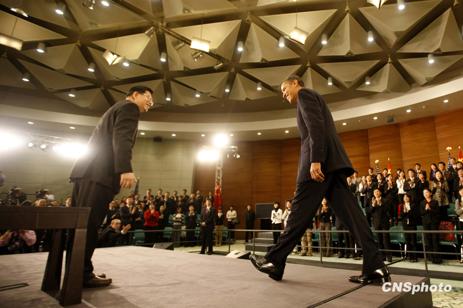 11月16日,正在上海访问的美国总统奥巴马现身位于浦东的上海科技馆,与四百余中国青年进行面对面交流。 中新社发 盛佳鹏 摄